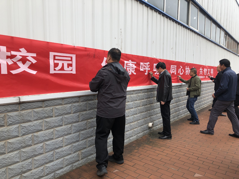 后勤保障处全体党员在印有“无烟校园 健康呼吸 同心协力 共创文明”宣传语的横幅上签名,并邀请周围师生参与,引导师生保护环境、不乱扔烟头,以期掀起“人人争当环境保护员、人人争做烟头清洁员”的保护校园环境热潮。